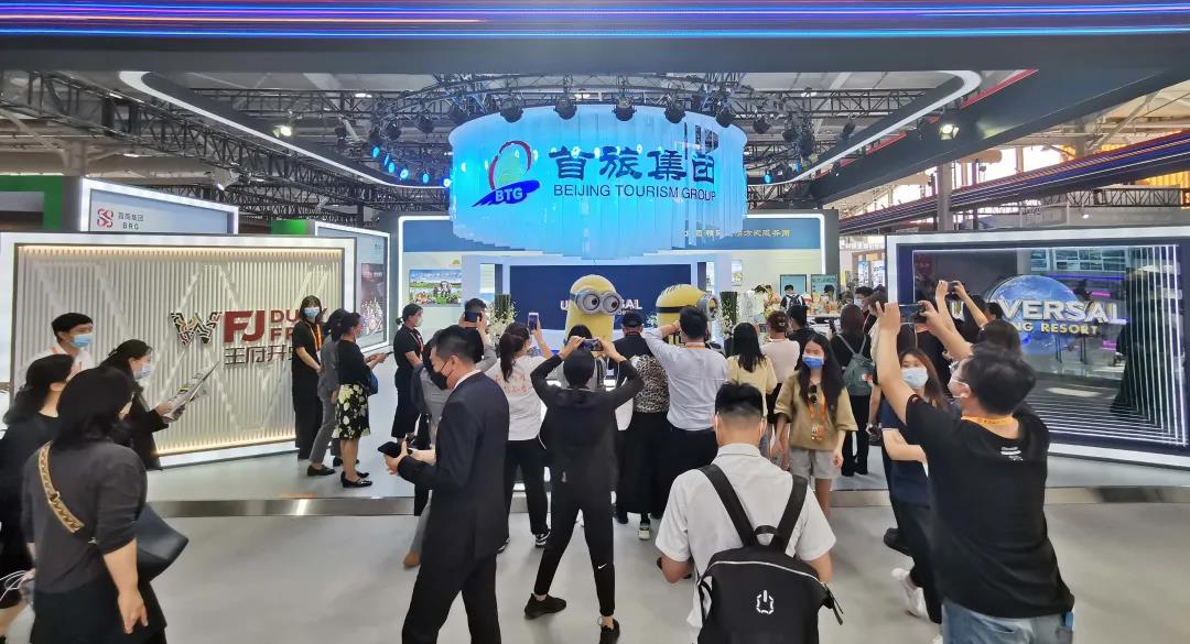 展会期间,来自北京环球度假区的“功夫熊猫”“小黄人”卡通IP形象现身华亿(中国)集团展台,搞怪的阿宝和顽皮的小黄人引来了大批现场观众合影留念。全聚德全新IP形象“萌宝鸭”也来到服贸会现场与观众互动,并带来了包括手提袋、马克杯、胸章、冰箱贴等多种年轻消费者喜爱的日常用品,引得大家纷纷下单购买。
